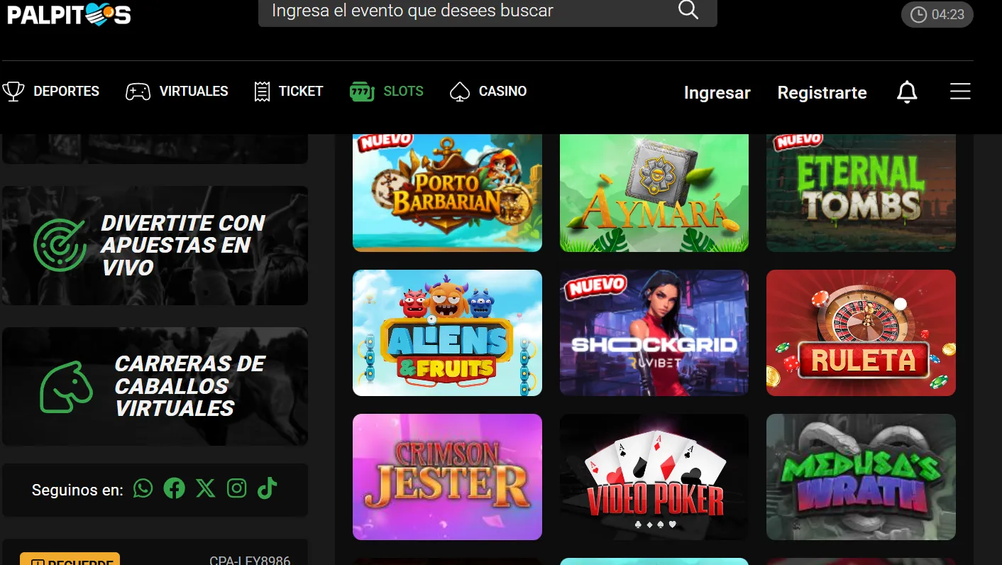 Palpitos ofrece casino en vivo, tragamonedas (slots), ruleta y mercados de apuestas deportivas activos en 2026. Nuestro equipo revisó el catálogo y confirmó títulos RNG y mesas en vivo así como cobertura de eventos locales e internacionales. Consulte reglas específicas y términos de cada juego dentro de la plataforma.